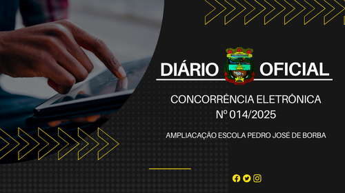 O Município de Caraá torna público que no dia 05 de janeiro de 2026, às 14:00 horas, no site www.portaldecompraspublicas.com.br serão recebidos os lances referente à Concorrência Eletrônico nº 14/2025, para construção de anexo ao prédio existente da Escola Municipal Pedro José de Borba, conforme edital, em conformidade com a Lei Federal nº 14.133/2021. Os interessados deverão cadastrar-se e enviar suas propostas, até o dia 05 de janeiro de 2026, às 13:00 horas, no site. Maiores informações serão prestadas aos interessados no horário das 8h às 12h, e das 13h30min às 17h, na Prefeitura Municipal de Caraá, pelo fone: (51) 99992-4567 ou no site: www.caraa.rs.gov.br e www.portaldecompraspublicas.com.br.