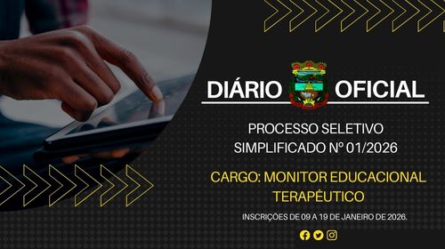 O Município de Caraá, representado por Bolivar Antônio de Souza Rabelo Gomes, Prefeito Municipal, comunica aos interessados que estarão abertas as inscrições para o PROCESSO SELETIVO SIMPLIFICADO Nº 01/2026, no período compreendido entre 09 a 19 de janeiro de 2026, das 08h às 12h e das 13h30min às 16h, em dias úteis, junto Av. Arno Von Saltiel, 478, Centro de Caraá, Centro de Caraá visando o Cadastro Reserva de Monitor Educacional Terapêutico, com 30 horas semanais, sob as condições previstas no Edital n° 01/2026.