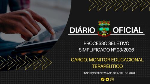 O Município de Caraá, representado por Bolivar Antônio de Souza Rabelo Gomes, Prefeito Municipal, comunica aos interessados que estarão abertas as inscrições para o PROCESSO SELETIVO SIMPLIFICADO Nº 03/2026, no período compreendido entre 20 a 30 de abril de 2026, das 08h às 12h e das 13h30min às 16h, em dias úteis, junto Av. Arno Von Saltiel, 478, Centro de Caraá, Centro de Caraá visando o Cadastro Reserva de Monitor Educacional Terapêutico, com 30 horas semanais, sob as condições previstas no Edital n° 14/2026.