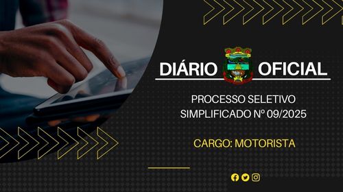 O Município de Caraá, representado por Bolivar Antônio de S. R. Gomes, Prefeito Municipal, comunica aos interessados que estarão abertas as inscrições para o PROCESSO SELETIVO SIMPLIFICADO Nº 09/2025, no período compreendido entre 15 de dezembro de 2025 a 12 de janeiro de 2026, das 08h às 12h e das 13h30min às 16h, em dias úteis, junto Av. Arno Von Saltiel, 478, Centro de Caraá, Centro de Caraá visando a Contratação de MOTORISTA para cadastro reserva, 44 horas semanais, sob as condições previstas nos Editais n° 37/2025.