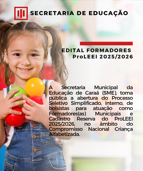 A Secretaria Municipal da Educação de Caraá (SME), observando a Lei nº 11.273/2006, a Portaria MEC nº 85, de 31 de janeiro de 2025, e em conformidade com o Caderno de Orientações do ProLEEI 2025/2026, torna pública a abertura do Processo Seletivo Simplificado, interno, de bolsistas para atuação como Formadores(as) Municipais e Cadastro Reserva do ProLEEI 2025/2026, no âmbito do Compromisso Nacional Criança Alfabetizada.