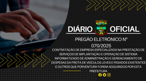 O Município de Caraá torna público que no dia 17 de setembro de 2025, às 10:00, no site https://potaldecompraspublicas.com.br serão recebidas as propostas referentes ao Pregão Eletrônico nº070/2025, para contratação de empresa especializada na prestação de serviços de implantação e operação de sistema informatizado de administração e gerenciamento de despesas da frota de veículos leves e pesados existentes e outros que porventura forem adquiridos por esta Prefeitura, em conformidade com a Lei Federal nº 14.133/21. Os interessados deverão cadastrar-se e enviarem suas propostas, até o dia 17 de setembro de 2025, às 09:00h, no site. Maiores informações serão prestadas aos interessados no horário das 8h às 12h, e das 13h30min às 17h, na Prefeitura Municipal de Caraá, pelo fone: (51) 99992-4567 ou no site: www.caraa.rs.gov.br.