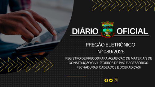 O Município de Caraá torna público que no dia 26 de dezembro de 2025, às 09:00, no site www.portaldecompraspublicas.com.br serão recebidos os lances referentes ao Pregão Eletrônico nº 89/2025, para aquisição de Aquisição de Materiais de Construção Civil (Forros de PVC e Acessórios, Fechaduras, Cadeados e Dobradiças), conforme edital, em conformidade com a Lei Federal nº 14.133/2021. Os interessados deverão cadastrar-se e enviar suas propostas, até o dia 26 de dezembro de 2025, às 08:00, no site. Maiores informações serão prestadas aos interessados no horário das 8h às 12h, e das 13h30min às 17h, na Prefeitura Municipal de Caraá, pelo fone: (51) 99992-4567 ou no site: www.caraa.rs.gov.br e www.portaldecompraspublicas.com.br.
